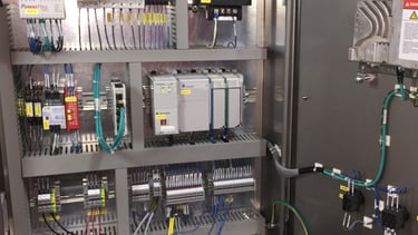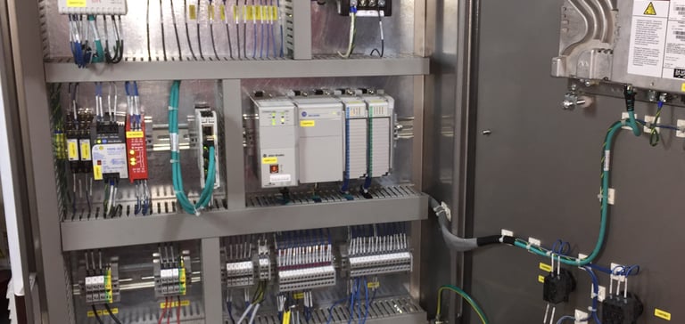 Instalación de tableros eléctricos de control con PLC, variadores de frecuencia, protecciones termomagnéticas, relés y HMI integrado. Diseño, montaje, cableado y pruebas completas antes de la instalación en sitio.