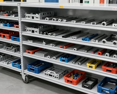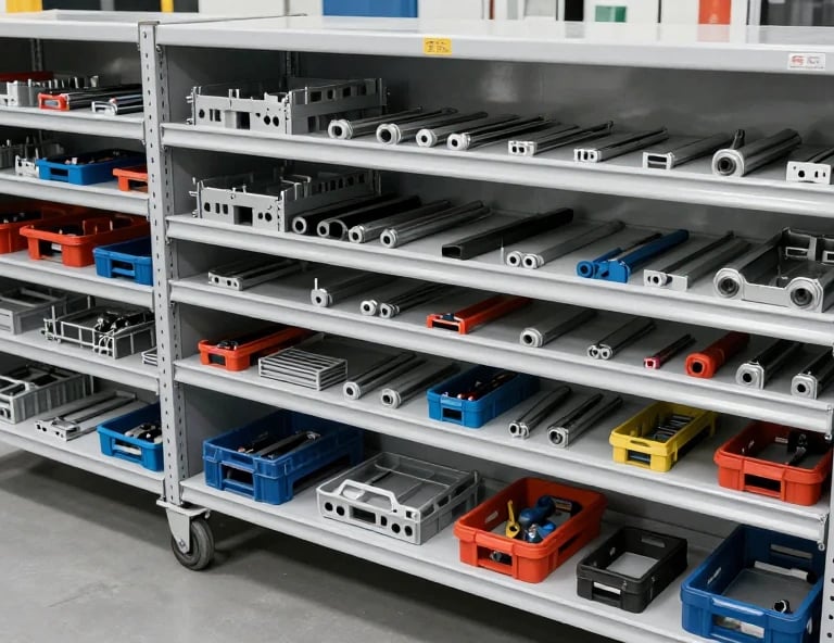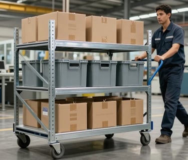 Para el abastecimiento de piezas, herramientas y componentes específicos a cada estación de ensamblaje. El carro lleva exactamente el kit necesario para una operación determinada — sin excesos, sin faltantes. Estantes planos, angulados o extensibles según el tipo de pieza. Altamente configurables.