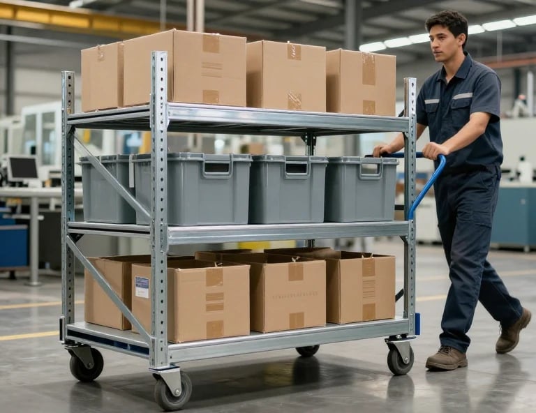Para transporte de cajas, bins, totes y materiales organizados por niveles. Estructura tubular de acero con 2 o más niveles de estantes planos o con labio de retención. Ideal para almacenes, líneas de producción y abastecimiento de puestos de trabajo. Capacidad por nivel hasta 300 kg.