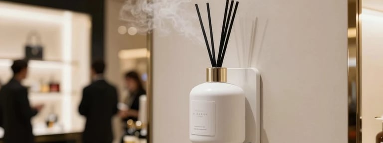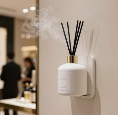 Difusores de aroma de marca estratégicamente ubicados. El olfato es el sentido más poderoso para generar recordación de marca — cada visita queda grabada en la memoria del cliente.