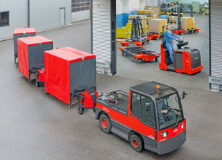 Sistema completo de abastecimiento: tractor + tren de carros interconectados. El tractor recorre una ruta fija pasando por todas las estaciones de trabajo y dejando o recogiendo los carros con el material necesario. Un operador abastece toda una línea de producción en cada vuelta.