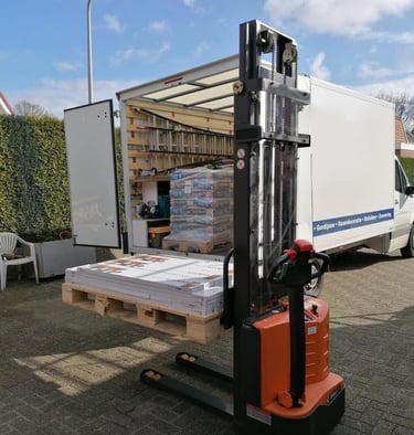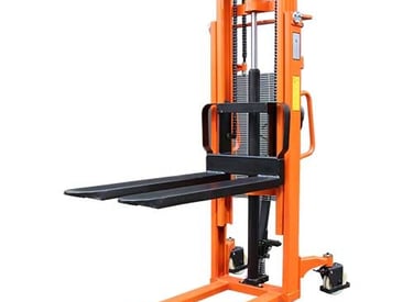 Apilador con motor eléctrico y batería recargable para operaciones de mayor volumen. Elevación eléctrica y tracción manual o autopropulsada. Para almacenes con operaciones frecuentes de apilado y desapilado. Capacidades de 1.000 a 2.000 kg y alturas de hasta 5 metros.