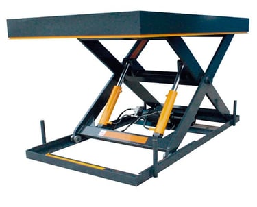Plataforma elevadora con mecanismo de tijera hidráulica que sube y baja la carga a la altura de trabajo óptima para el operador. Elimina el agacharse y el levantamiento de cargas desde el piso. Para líneas de ensamblaje, empaque y carga de vehículos. Fija o con ruedas.
