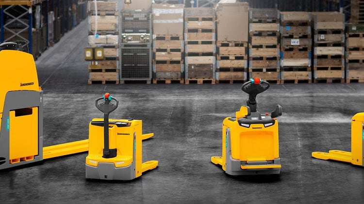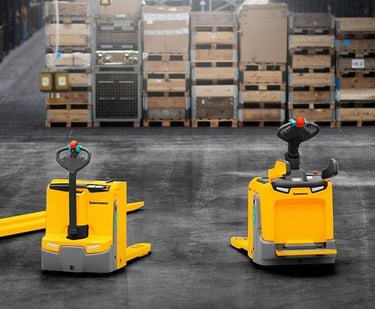 Versión motorizada de la transpaleta manual. Tracción eléctrica con batería recargable para operaciones de mayor distancia y frecuencia. El operador camina detrás o monta sobre el equipo según el modelo. Para almacenes grandes con recorridos largos y operaciones intensivas.