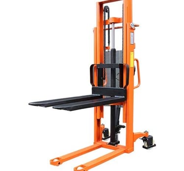Equipo manual con mástil y horquillas que eleva paletas y cargas mediante bomba hidráulica accionada por el operador. Sin batería ni motor eléctrico. Para almacenes con bajo volumen de operaciones de apilado. Capacidades típicas de 1.000 a 1.500 kg y altura de elevación hasta 3 metros.