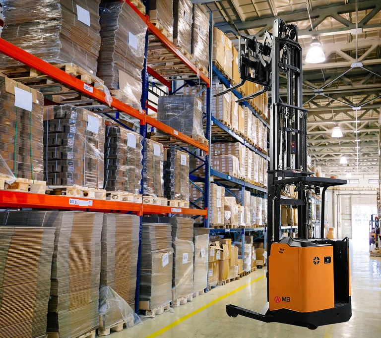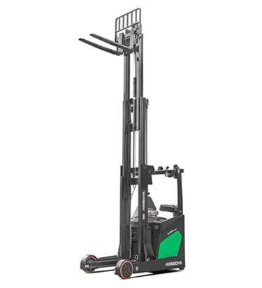 Carretilla eléctrica con mástil retráctil para acceder a pasillos estrechos y alcanzar estanterías de gran altura — hasta 10 metros. Para almacenes de alta densidad donde el espacio es crítico. El mástil se extiende hacia adelante para colocar o retirar la paleta sin que el equipo entre al pasillo.